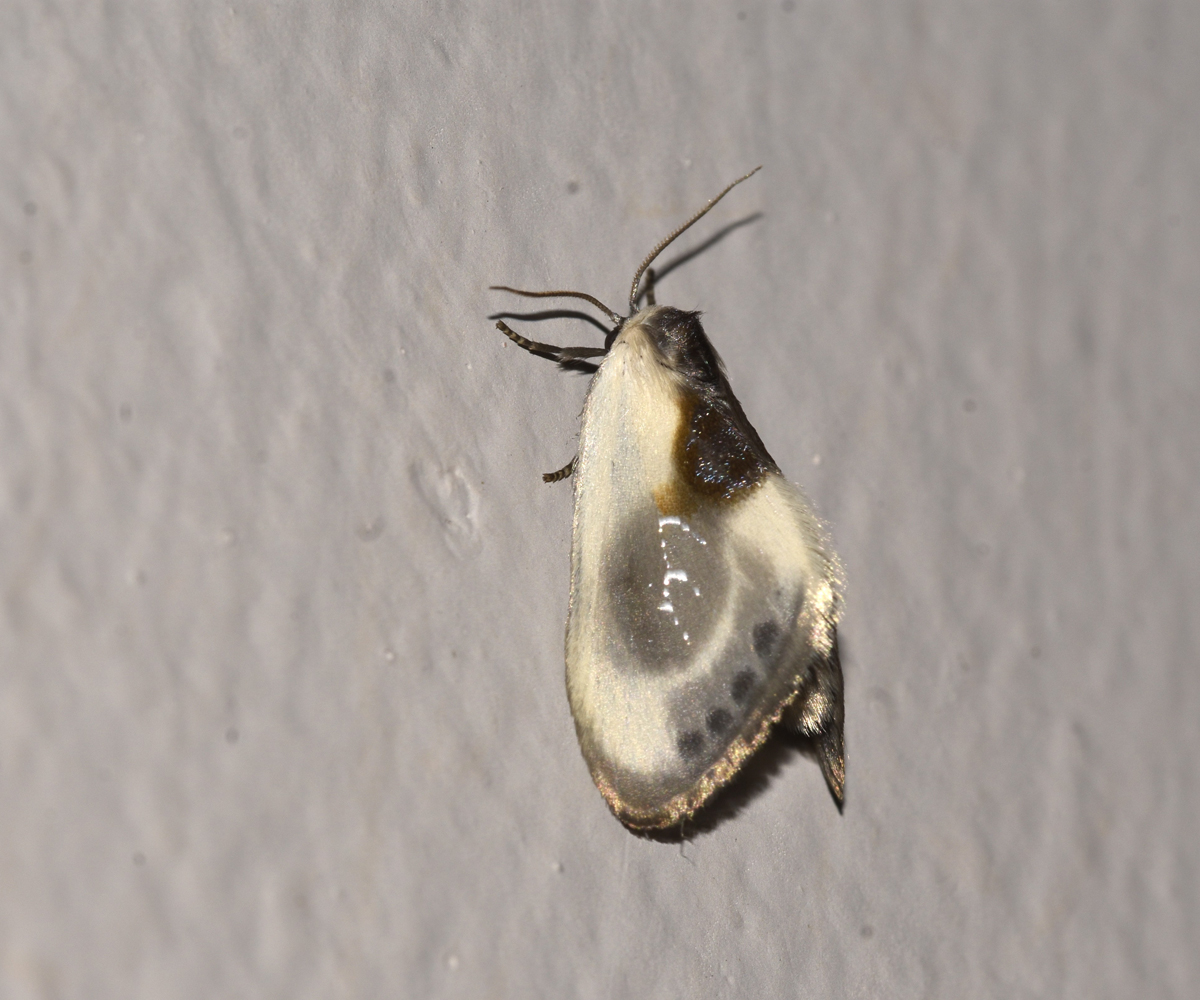 Τόσο τα εμπρόσθια, όσο και τα οπίσθια φτερά έχουν χρώμα λευκό της πορσελάνης. Στο εμπρόσθιο φτερό υπάρχει μια σειρά από τέσσερις μικρές γκρίζες κηλίδες κατά μήκος της εξωτερικής άκρης του. Η εσωτερική άκρη εμφανίζει ένα μεγάλο σκούρο καφέ λεκέ, ακολουθούμενο από έναν πιο ανοιχτόχρωμο καφέ λεκέ που εκτείνεται προς τη μέση του φτερού.
