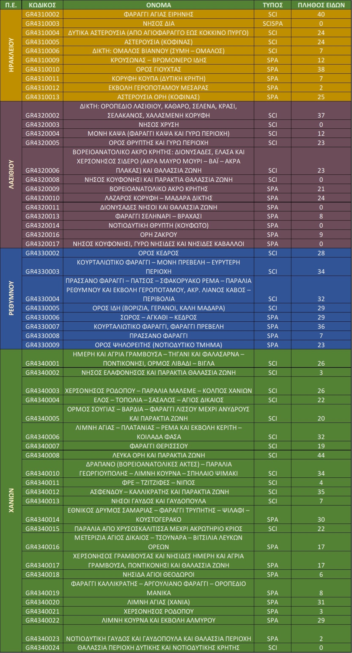 Σύμφωνα με πρόσφατα επικαιροποιημένα ερευνητικά στοιχεία για το έτος 2025 (Παμπέρης Λ.Ν., 2025, με προσθήκες 3 ειδών στην GR4320013 από καταγραφές Κ. Μπορμπουδάκη 2025), το πλήθος ειδών πεταλούδων ανά περιοχή, για τις περιοχές Natura 2000 της Κρήτης αποτυπώνεται στον Πίνακα. Αρκετές από αυτές τις περιοχές χρήζουν μεγαλύτερης διερεύνησης και δυνητικά μπορεί να περιλαμβάνουν περισσότερα είδη.
